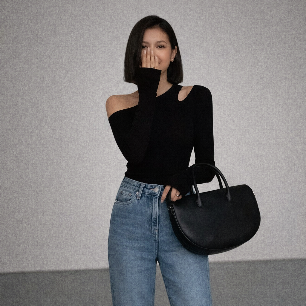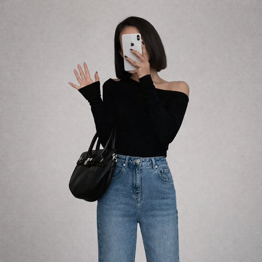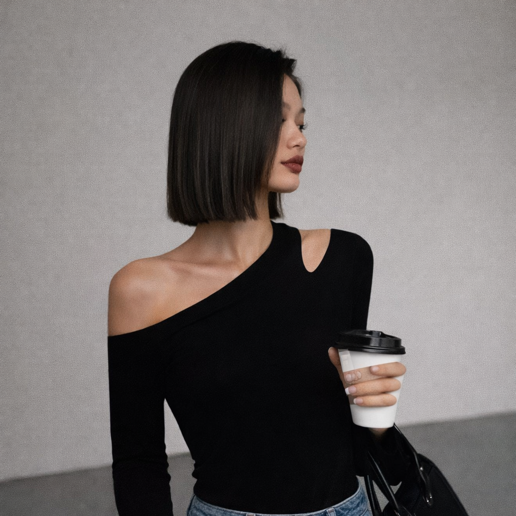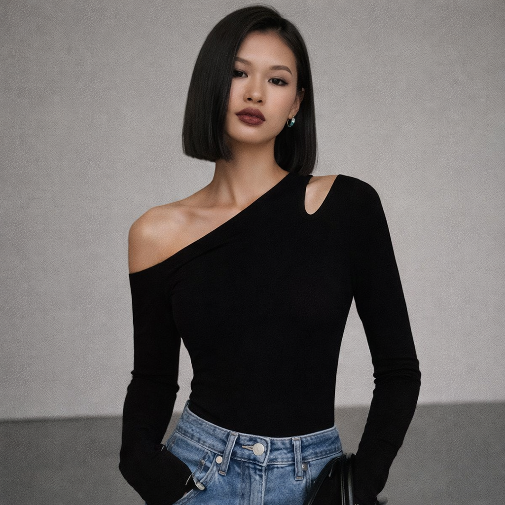 Camiseta de manga larga con hombros descubiertos y cuello oblicuo para mujer